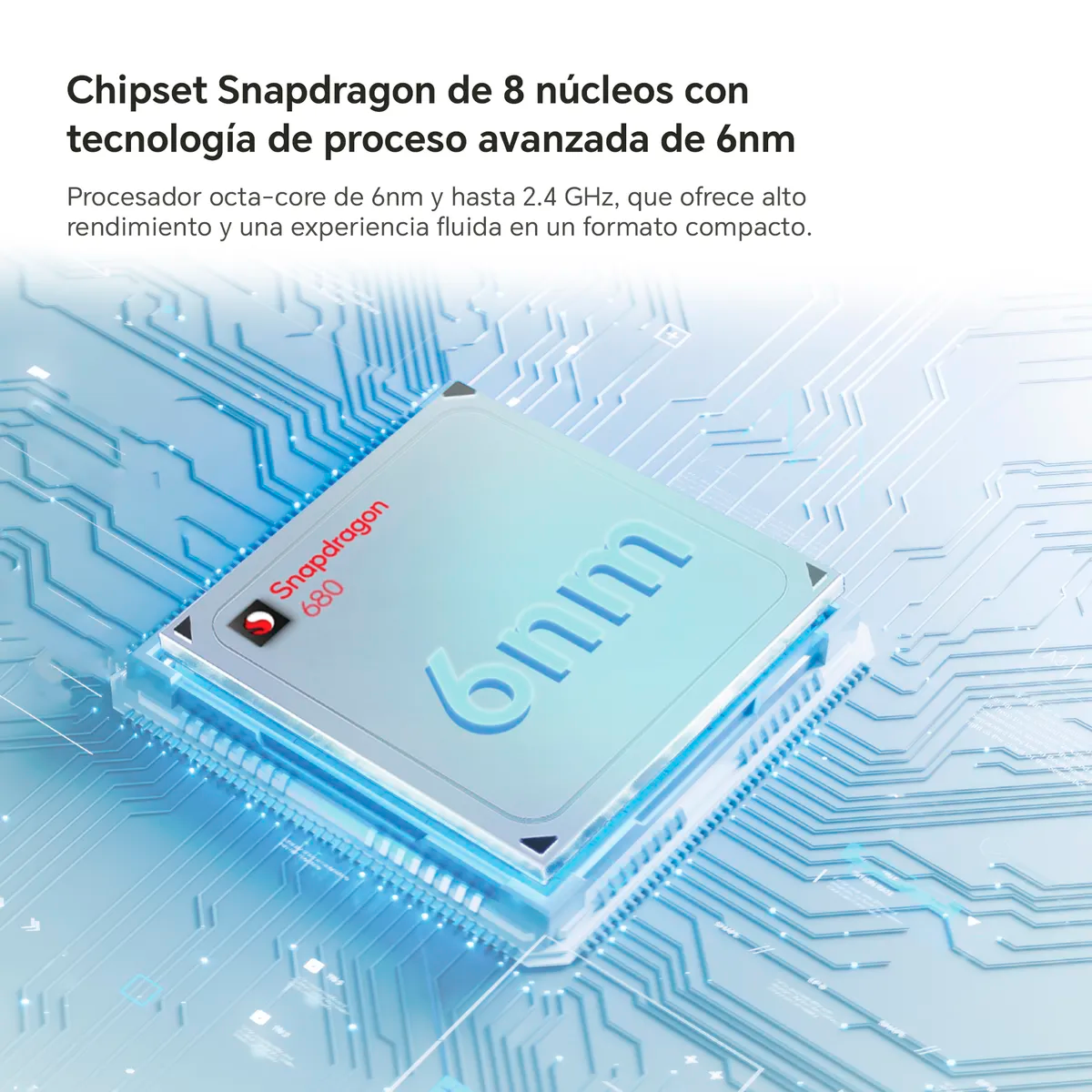 - Procesador Qualcomm SM6225 Snapdragon 680 (Octa-Core hasta 2.4GHz), GPU Adreno 610, RAM 4GB (4+4 Turbo)